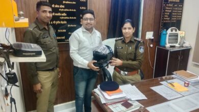 थाना प्रभारी सवितासिंह जाटव ने पत्रकार अमर चौधरी को हेलमेट प्रदान किया