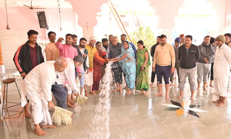 – महापौर सहित वार्डवासियों ने झाड़ू से सफाई की, पानी से मंदिर परिसर व दीवारों को किया साफ