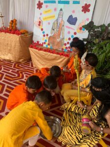 गुरु पूर्णिमा के उपलक्ष्य में बच्चों ने गुरु की महिमा मंडित करते हुए गुरु धौम्य एवं उनके आज्ञाकारी शिष्य आरुणि के प्रसंग को नाटक के रूप में प्रस्तुत किया। नाटक के माध्यम से यह बताया गया कि गुरु हमें अज्ञानता के अंधकार से ज्ञान के प्रकाश की ओर ले जाते हैं। विद्यार्थियों ने गुरु द्रोणाचार्य, अर्जुन एवं एकलव्य के प्रसंग का भी सुंदर वर्णन किया।