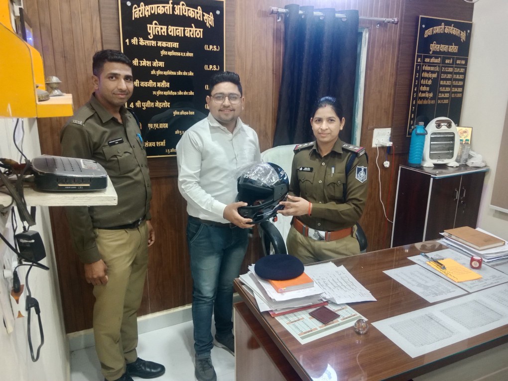 थाना प्रभारी सवितासिंह जाटव ने पत्रकार अमर चौधरी को हेलमेट प्रदान किया
