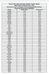भोपाल। माध्यमिक शिक्षा मंडल, मध्य प्रदेश द्वारा वर्ष 2026 की हाईस्कूल (10वीं) परीक्षा का परिणाम जारी कर दिया गया है। मुख्यमंत्री डॉ मोहन यादव ने भोपाल से रिजल्ट की घोषणा की। इस बार कुल 73.42% नियमित परीक्षार्थी सफल रहे, जिसमें एक बार फिर छात्राओं ने बाज़ी मारते हुए शानदार प्रदर्शन किया।